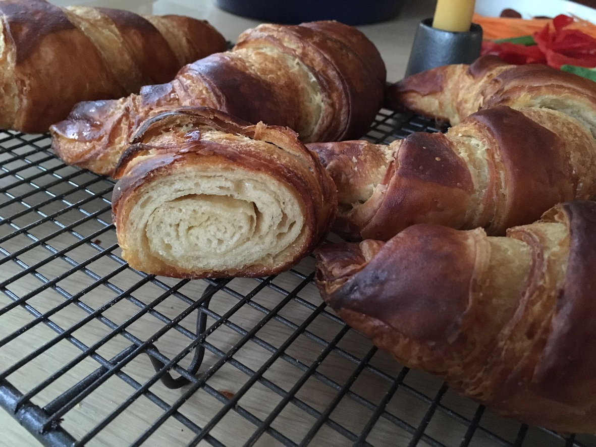 Verwarm de oven voor op 190 C. Schuif de bakplaat in de oven (onder het midden) en besproei de zijkanten van je oven met water voor een vochtige atmosfeer. Bak de croissants af in 20 minuten.